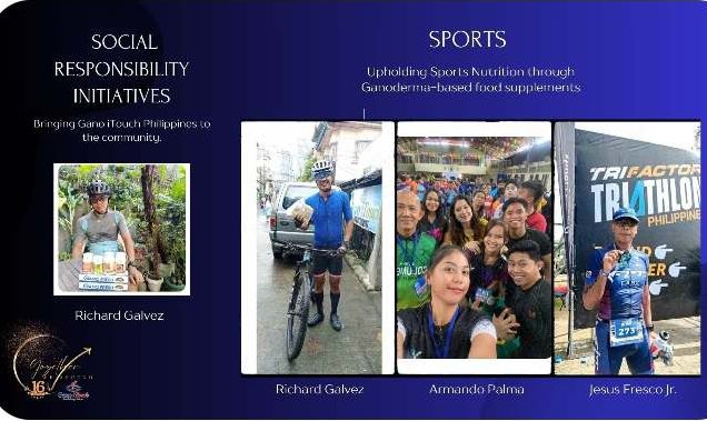 JESUS FRESCO JR. (right photo) is Director level in position, a finisher in the 60-year old category of the TRIFACTOR TRIATHLON PHILIPPINES held in Subic last February 2024. The event comprises swimming for 1.5 km, biking for 40 km running for 10 km. Jesus is taking Sakanno and Eternity Cordyceps capsules. RICHARD GALVEZ (left photo) is a member in position, 6th placer in 50-60 year old category during the ATTACK UNRESTRICTED GRAVEL BIKE RACE held in Nueva Ecija last January 2024. Richard is talking Ganoderma + Excellium capsules.